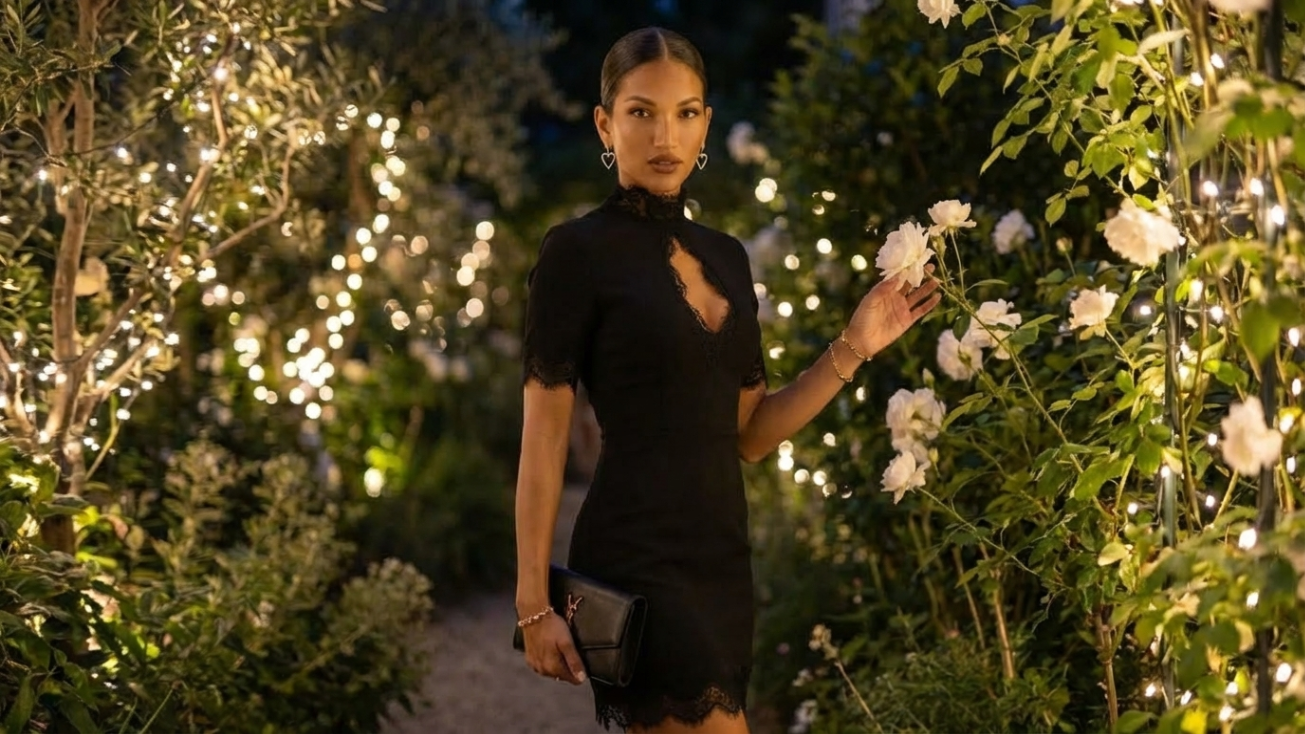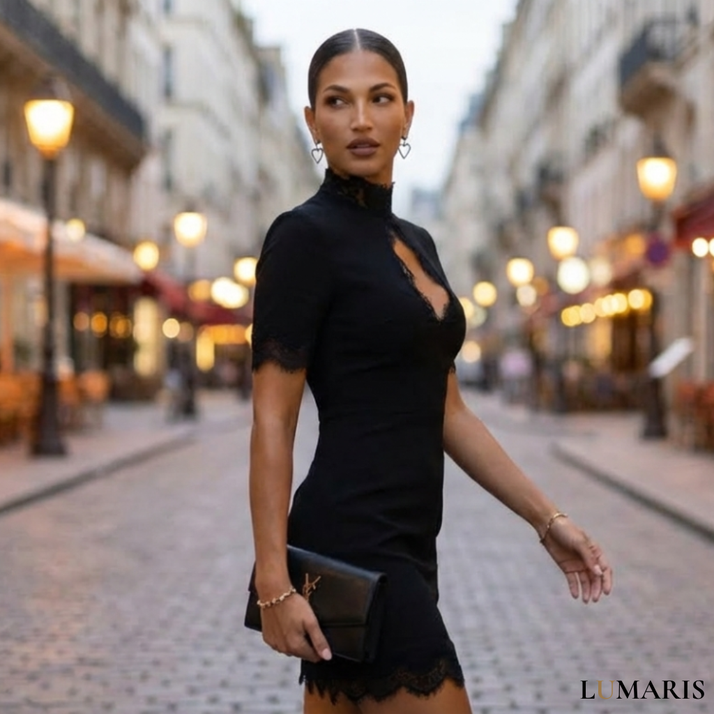 O recorte cut-out frontal é o coração do vestido: uma abertura cirúrgica no busto que equilibra o que revelar e o que guardar. Ousado o suficiente para ser inesquecível. Contido o suficiente para ser impecável.